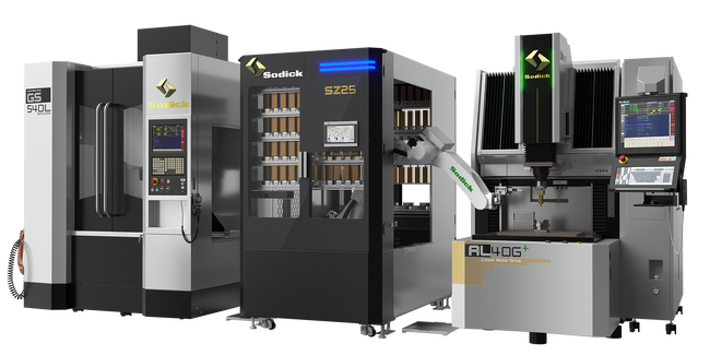 (左から)リニアモータ駆動 マシニングセンタ「GS540L」、電極・ワーク搬送装置「SZ25」、リニアモータ駆動 高速・高性能 精密形彫り放電加工機「AL40G+」