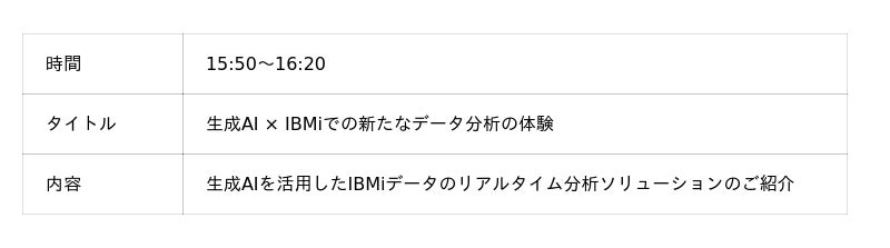 当日は、「生成AI × IBMiでの新たなデータ分析の体験」と題したセッションに登壇し、IBMiに蓄積された基幹業務データをリアルタイムに分析し、企業のデータドリブン経営を支援する新たなソリューションをご紹介します。
