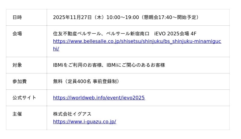 日販テクシード株式会社(本社:東京都中央区、代表取締役社長:藤澤 徹、以下 当社)は、2025年11月27日(木)に開催される株式会社イグアス主催のIBMiユーザー向けイベント「iEVO2025」に、プラチナスポンサーとして出展することをお知らせいたします。