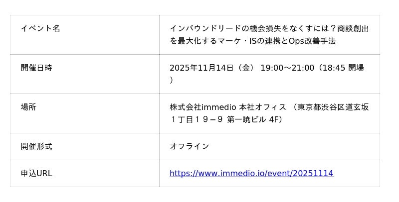 株式会社インゲージ(本社:大阪府大阪市、代表取締役:和田 哲也)は、株式会社immedioとインバウンドリードの機会損失を防ぎ、商談創出を最大化するためのオフラインイベントを2025年11月14日(金)にimmedio社本社にて共催いたします。