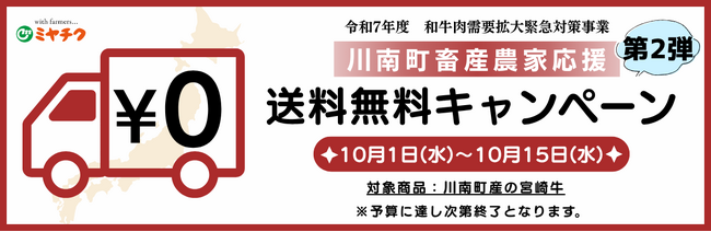 株式会社ミヤチク(本社:宮崎県都城市/代表取締役社長:船ヶ山 祐二)が運営する通販サイト「ミヤチクオンラインショップ」にて、【川南町畜産農家応援】送料無料キャンペーン第2弾を実施中です。 川南町の生産者が心を込めて育てたお肉を、この機会にぜひご家庭の食卓や大切な方への秋の贈り物にご利用ください。