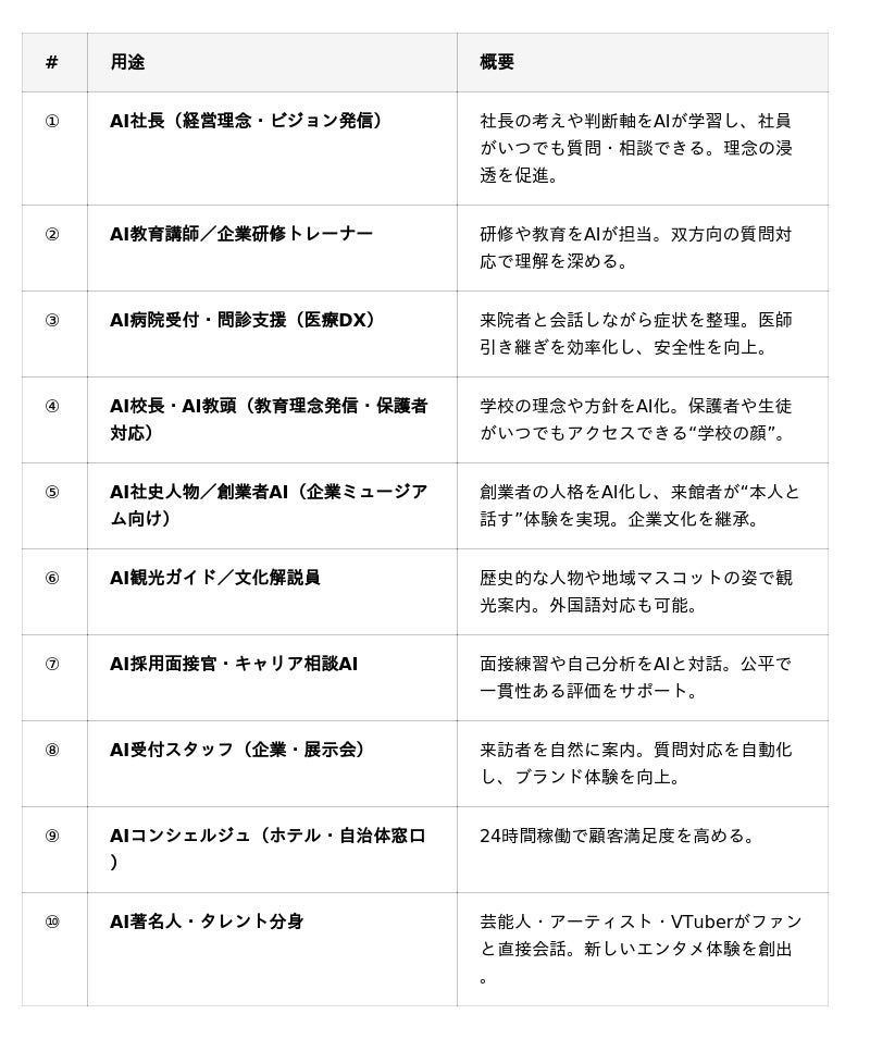 近年、AIキャラクター・デジタルヒューマンの技術進歩とともに、「AI社長」などに代表されるように企業・教育・接客領域での導入が加速しています。