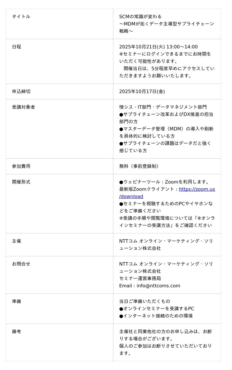 NTTコム オンライン・マーケティング・ソリューション株式会社(本社:東京都品川区、代表取締役社長:稲葉 秀司、以下NTTコム オンライン)は、2025年10月21日(火)に製造業や流通業にて情報システム・IT部門、データマネジメント部門等に所属している方を対象としたオンラインセミナーを開催いたします。本セミナーはサプライチェーン戦略における代表的なマスターデータと主な問題、MDMによる解決について解説する内容となっています。