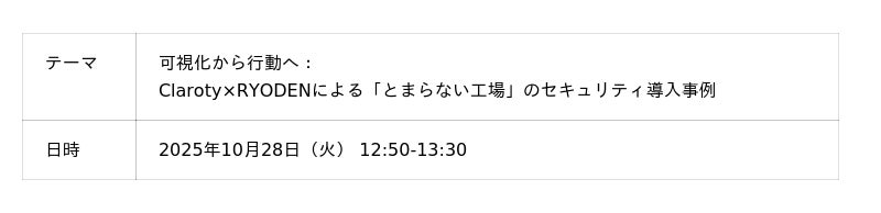 株式会社RYODENは、2025年10月28日(火)、ONE FUKUOKAにて開催される、情報セキュリティに関する専門イベント「Security Days Fall 2025 Fukuoka」にパートナーであるClaroty, Ltd.(以下、「Claroty社」)と共に出展いたします。