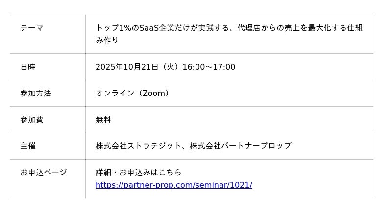株式会社ストラテジット(本社:東京都港区、代表:加藤 史恵、以下当社)は、株式会社パートナープロップ(本社:東京都千代田区、代表取締役CEO:井上 拓海、以下「パートナープロップ」)と共催で、2025年10月21日(火)16:00~17:00にオンラインにて、パートナービジネスの仕組み化をテーマとした無料ウェビナーを開催いたします。
