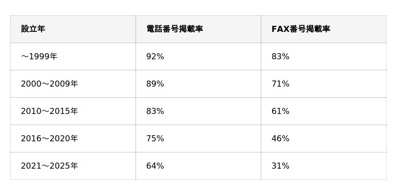 設立年が新しい企業ほど、従来型のコンタクト手段の掲載率が著しく低下しています。具体的には、1999年以前設立企業と2021年以降設立企業を比較すると、電話番号掲載率には28ポイント、FAX番号掲載率には52ポイントの差がありました。