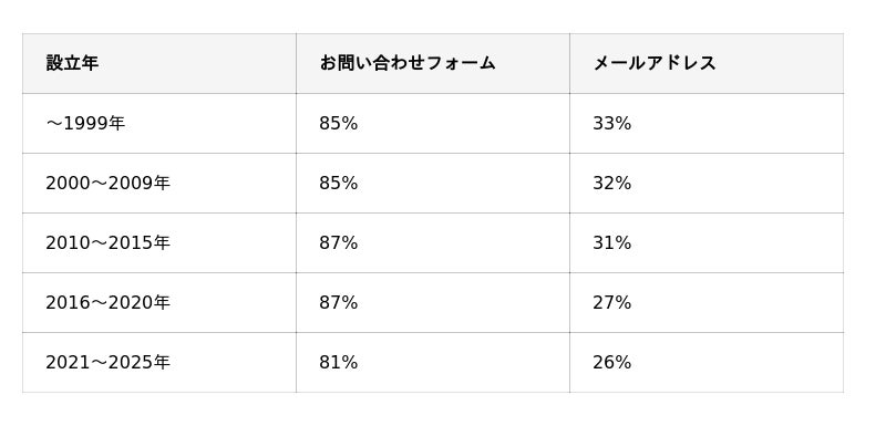 一方、お問い合わせフォームは2021年以降にやや減少していますが、設立年にかかわらず80%以上の高い設置率を維持しています。また、メールアドレスは新しい企業ほど公開率がやや低下する傾向が見られました。