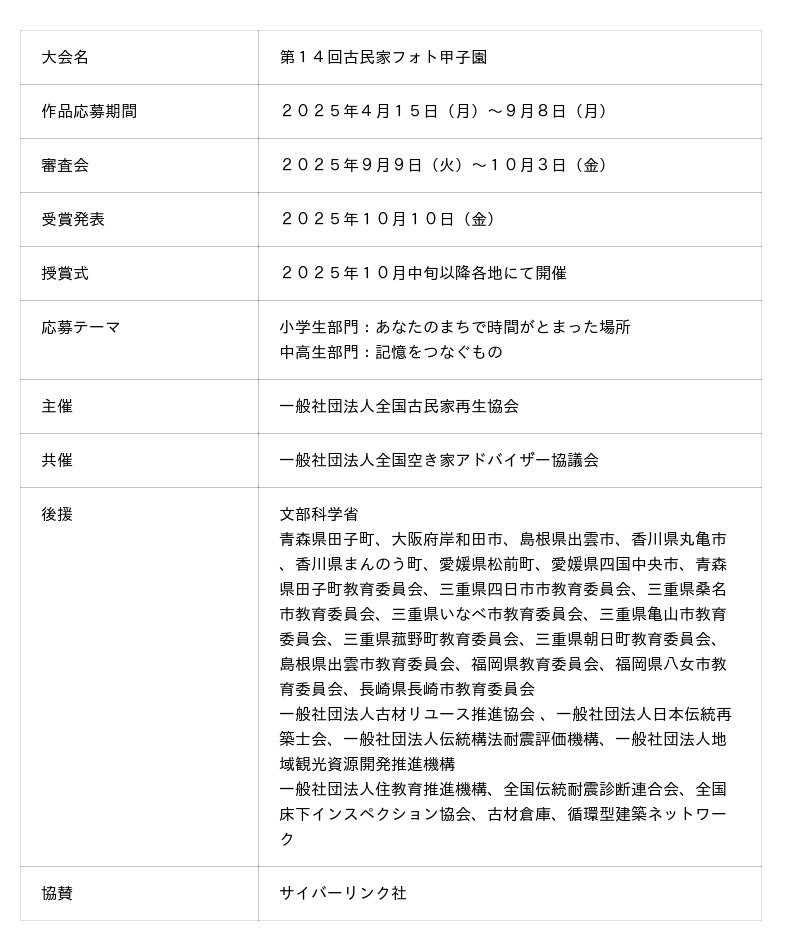 [表: https://prtimes.jp/data/corp/163421/table/8_1_422a4e00fd717266e4f010d464bc9d8a.jpg?v=202510140817 ][画像4: https://prcdn.freetls.fastly.net/release_image/163421/8/163421-8-471f6e077fc8ebd2377426b45072b91e-709x423.jpg?width=536&quality=85%2C75&format=jpeg&auto=webp&fit=bounds&bg-color=fff ]一般社団法人全国古民家再生協会