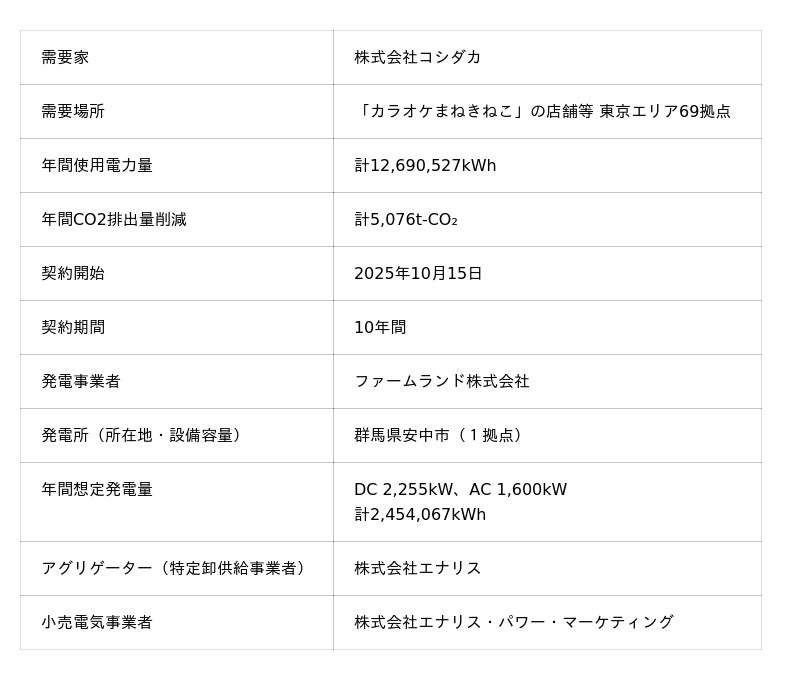 株式会社コシダカ(東京本社:東京都渋谷区、代表取締役社長 腰高博、以下「コシダカ」)、ファームランド株式会社(群馬県前橋市、代表取締役 岩井雅之、以下「ファームランド」)、株式会社エナリス(東京都千代田区、代表取締役社長 都築実宏、以下「エナリス」)および株式会社エナリス・パワー・マーケティング(東京都千代田区、代表取締役 内田泰裕、以下「EPM」)は、コシダカが展開する「カラオケまねきねこ」等の東京エリア69拠点へ追加性のある再生可能エネルギー(以下、再エネ)を供給するオフサイトPPA[1]契約を締結しました。2025年10月15日より供給を開始します。