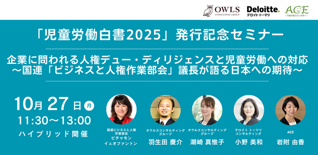 株式会社オウルズコンサルティンググループ(東京都港区/代表取締役CEO羽生田慶介)は、デロイト トーマツ コンサルティング合同会社(東京都千代田区/代表執行役 神山友佑)と認定NPO法人ACE(東京都台東区/代表 岩附由香)とともに、児童労働に関する最新状況や企業に求められる対応などを包括的にまとめた「児童労働白書2025 ―ビジネスと児童労働―」を今秋、5年ぶりに発行します。