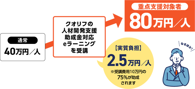 2025年10月15日、クオーク株式会社(本社:東京都渋谷区、代表取締役:前川英之、以下クオーク)は、キャリアアップ助成金・正社員化コースの受給額アップを狙うスキーム「キャリアアップ助成金アシスト10」の提供を開始します。本スキームを実行する手段(プロダクト)として、同社のeラーニングプラットフォームQualif(クオリフ)を利用した、標準学習時間10時間の人材開発支援助成金対応のeラーニング研修「生成AI時代のDX」(価格:10万円/人・税込)を提供。このeラーニング研修を受講いただくことで、キャリアアップ助成金・正社員化コースの「重点支援対象者」の要件を満たすことになり、キャリアアップ助成金の受給額が40万円から80万円に倍増します(中小企業の場合)。