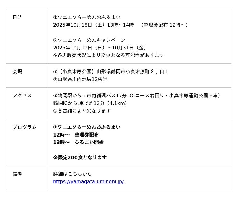 一般社団法人海と日本プロジェクトin山形は、10/18(土)に鶴岡市で開催されるつるおか大産業まつりで未利用魚を活用した新しいラーメン出汁”ワニエソらーめん”のおふるまいを実施いたします。翌日の10/19(日)から10/31(金)まで庄内地域のラーメン店12店舗で、ワニエソらーめんを味わうことができるキャンペーンを開催いたします。