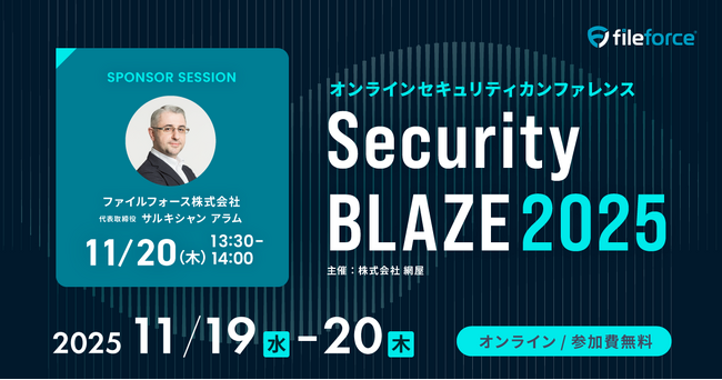 クラウドストレージ「Fileforce」を提供するファイルフォース株式会社(本社:東京千代田区 代表取締役:サルキシャン アラム)は、株式会社網屋(本社:東京都中央区 代表取締役社長 石田 晃太)主催のカンファレンス「SecurityBLAZE 2025」のDAY2|11月20日(木)13:30-14:00のスポンサー講演にて、代表取締役 アラム・サルキシャンが登壇いたします。