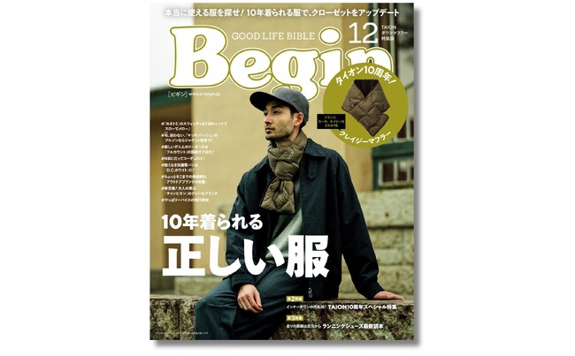 10月16日 (木) 発売のBegin12月号では、「10年後も着続けたい服」を紹介する第1特集に加え、堅実なモノ作りでツウからの信頼も厚いインナーダウンの雄「TAION」の10周年を祝した企画も!