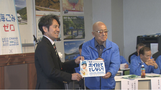 贈呈式では一般社団法人海と日本プロジェクトinやまなしから、山梨県トラック協会の坂本幸晴会長に、ごみのポイ捨て防止を呼びかける啓発ステッカー1000枚が贈られました。ステッカーは、山梨県出身の漫画家、吉沢やすみさんの人気アニメ「ど根性ガエル」とコラボしたもので3年連続のキャラクター使用となります。また、山梨県内でも増え続けるインバウンド客にも呼びかけようと去年同様、日本語に加え英語、中国語の3か国語で表記しています。山梨県トラック協会の坂本幸晴会長は、「協会では絶対にごみを捨てないで持ち帰るよう呼びかけている。そしてこのステッカーがあることでドライバーの心構えも変わる。山梨をきれいにしていきたい。」と力強く述べました。