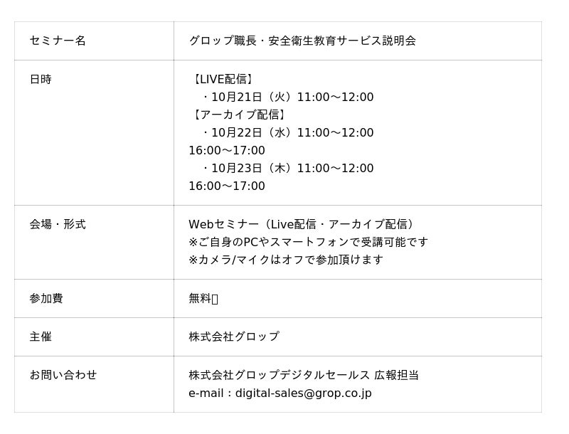 本説明会では、弊社の各種教育サービスについて職長教育を軸に、その作り、仕組みを図解解説してゆきます。参加後にはきっと「自社社員にどのように学んでもらうべきか」が見通せるようになります。さらに、法定講習の成功を阻む3つの課題を解説し、その解決策を具体的にご紹介しながら、グロップが提供する 職長・安全衛生教育サービスの特徴・導入事例・導入フローをわかりやすくお伝えします!
