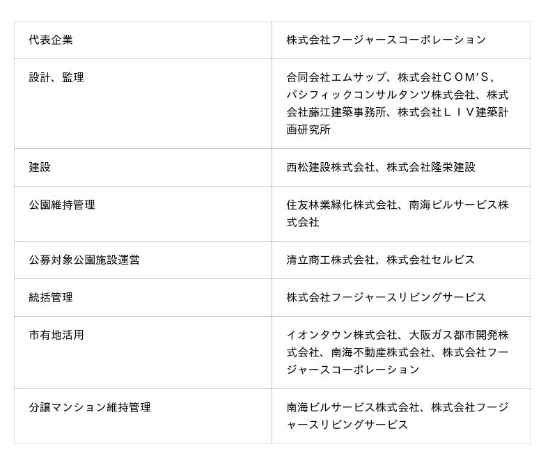 本事業では、株式会社フージャースコーポレーションが代表企業を務め、都市公園事業および市有地活用事業を担う特定目的会社への出資を行い、施設整備、維持管理をすることで、地域の方々に今まで以上にご利用頂ける魅力ある公園づくりと地域活性化に貢献してまいります。