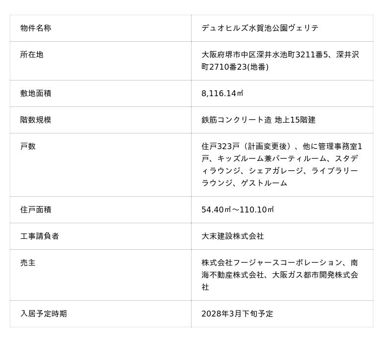 南海不動産株式会社(本社:大阪府大阪市 代表取締役社長:村上一久)、大阪ガス都市開発株式会社(本社:大阪府大阪市 代表取締役社長:友田泰弘)は、堺市中区水賀池公園整備事業において、新築マンション「デュオヒルズ水賀池公園ヴェリテ」(大阪府堺市中区深井水池町)の分譲を開始し、マンションギャラリー(大阪府堺市中区深井清水町)にて案内開始いたします。