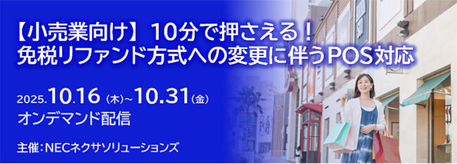 NECネクサソリューションズは、「10分で押さえる!免税リファンド方式への変更に伴うPOS対応」セミナーを、10月31日(金)までオンデマンド配信しています。お申し込みは2025年10月30日(木)まで受け付けています。