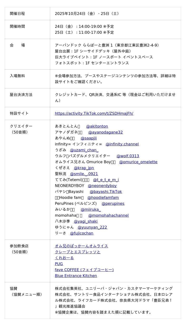 ショートムービープラットフォーム「TikTok(ティックトック)」は、2025年10月24日(金)と25日(土)にアーバンドック ららぽーと豊洲1にて開催するオフラインイベント「TikTok Autumn Fest」において、12組の人気クリエイターや、集英社「漫ぷくメシ!」をはじめとする、注目コンテンツの参加が追加決定したのでお知らせします。