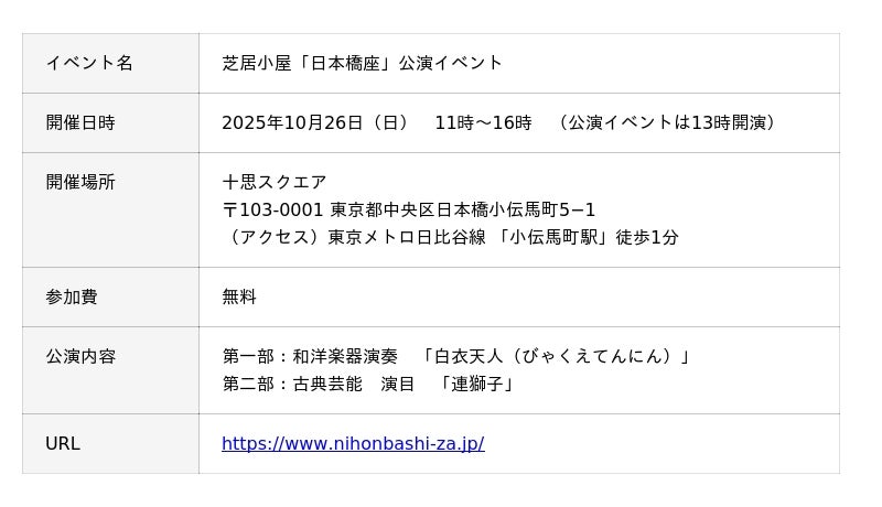 このたび、当社が協賛する『芝居小屋「日本橋座」公演』は、江戸の粋な文化を五感で体験できるイベントです。当日は、本格的な伝統芸能の公演のほか、日本橋ならではの味覚が楽しめるグルメもお楽しみいただけます。