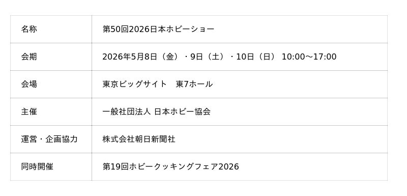 つくる楽しさや可能性、半世紀つづいた日本ホビーショーの歩みを大切に、これからもホビー・ハンドメイドの輪を広げ、人と人、アイデアや情熱、技術をつなぐ場でありたいという想いを込めています。[画像3: https://prcdn.freetls.fastly.net/release_image/129372/18/129372-18-e6d44812fc36e7b32b04a2252b80b2a3-2067x1379.jpg?width=536&quality=85%2C75&format=jpeg&auto=webp&fit=bounds&bg-color=fff ]