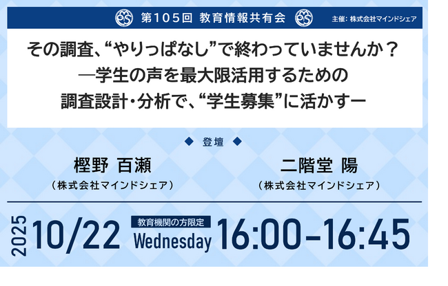 第105回となる今回は「その調査、“やりっぱなし”で終わっていませんか?―学生の声を最大限活用するための調査設計・分析で、“学生募集”に活かすー」 というテーマにて教育機関の方限定で実施いたします。