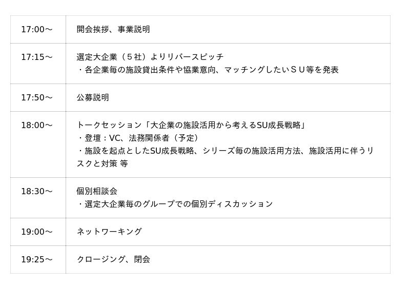 上記大企業との協業を視野に、大企業が提供する施設や設備等を活用し自社の事業開発等を進めることを目指すスタートアップ・中小企業を募集します。■対象者
