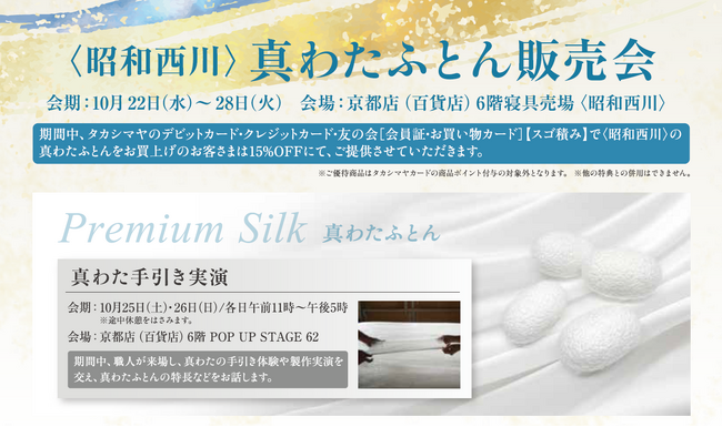 昭和西川株式会社(所在地:東京都中央区、代表:西川惠)は2025年10月22日(水)~28日(火)までの期間、京都高島屋6階にて「真わたふとん販売会」を開催いたします。期間中の10月25日(土)、26(日)の2日間に限り「真わた手引き実演」を行います。匠の技と温もりを間近で感じられる貴重な機会です。