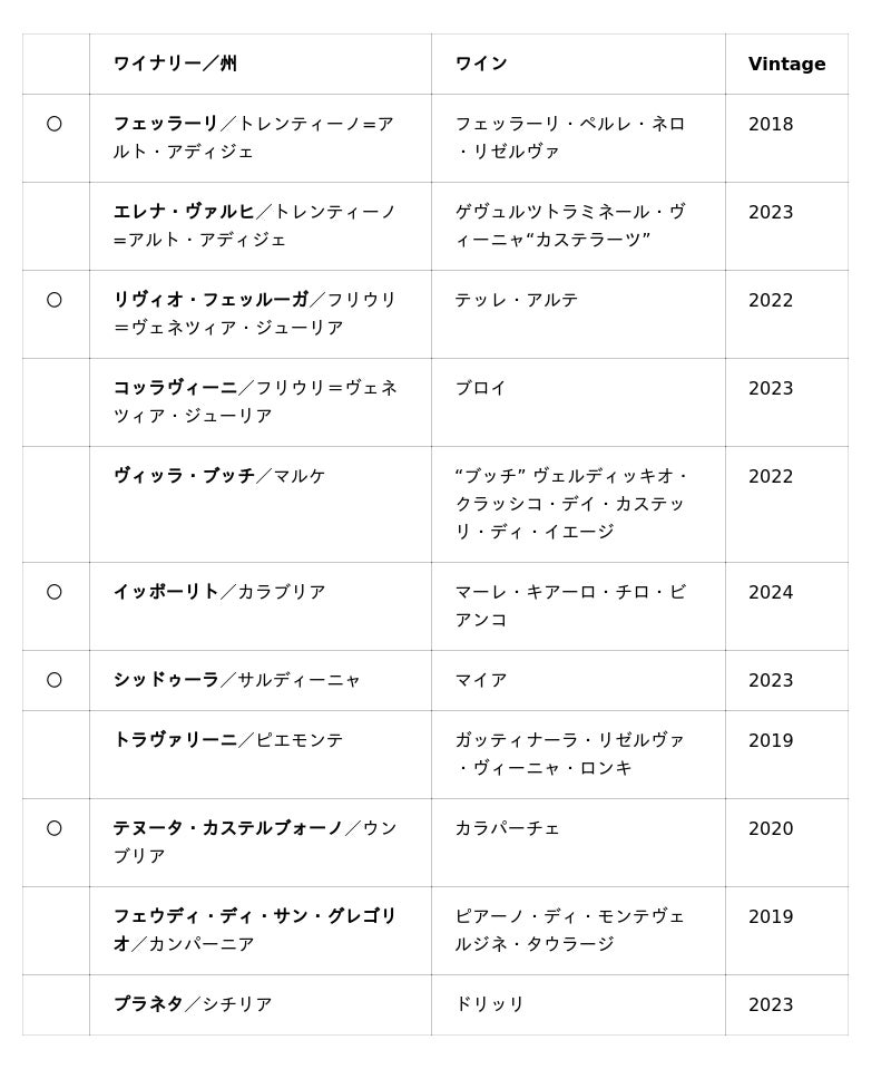〇印は受賞ヴィンテージが出荷可能です