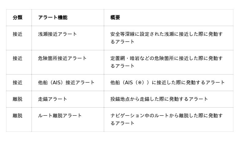 なお、今回、追加搭載する「アラート機能」については、2017年に国土交通省海事局が公表した「船舶におけるスマートフォンアプリ活用のためのガイドライン(https://www.mlit.go.jp/common/001176064.pdf)」を参考に開発しておりますが、引き続き、当社では実際にボートやヨットに乗られるユーザーや、マリーナスタッフなどからのご意見・ご要望等により、継続的に改良・改善を進めて参ります。