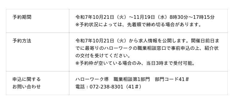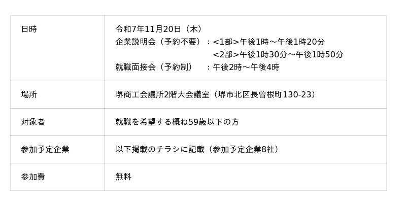 堺市では、幅広い世代の雇用促進を図るため、ハローワーク堺と堺商工会議所との共催で「さかい企業説明会&就職面接会」を以下のとおり開催します。