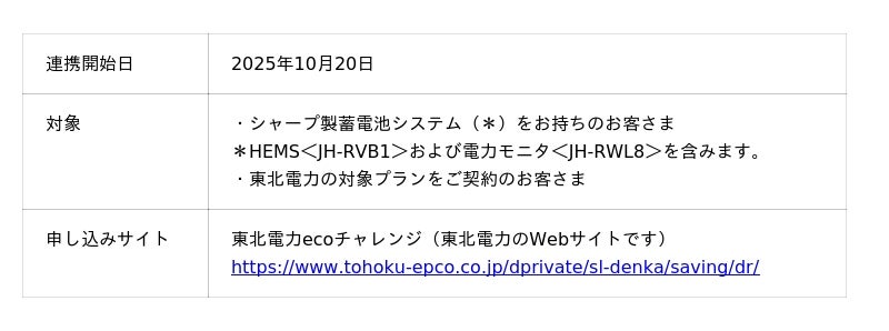 シャープエネルギーソリューション株式会社は、東北電力株式会社(本店:宮城県仙台市、代表取締役社長 社長執行役員:石山 一弘、以下、東北電力)が提供するDRサービス(※1)「東北電力機器制御型ecoチャレンジ 節電チャレンジ(機器制御型)」とシャープ製蓄電池システムの連携を、本年10月20日(月)に開始しました。