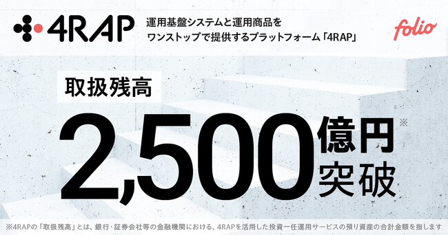 SBIグループで革新的な金融ソリューションを提供する株式会社FOLIOホールディングスの子会社である株式会社FOLIO(本社:東京都千代田区、代表取締役:四元 盛文、以下:FOLIO)は、投資一任プラットフォーム「4RAP(フォーラップ)」の取扱残高が2025年10月21日(火)時点で2,500億円を突破したことをお知らせします。
