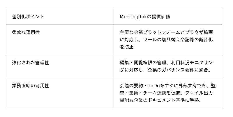 Google Meet、Zoom、Microsoft Teamsなどの基本機能と比較し、Meeting Inkは「ガバナンス」と「業務直結の可用性」で明確な差別化を図っています。