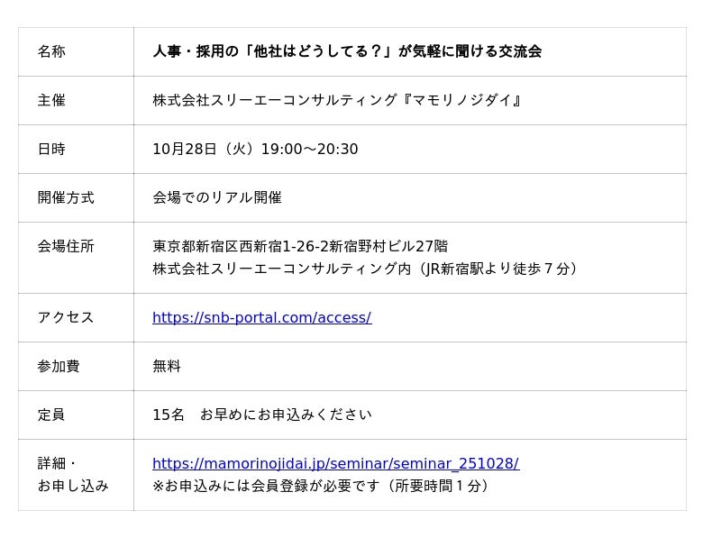 中小企業の守備力を強くするメディア『マモリノジダイ』を運営する株式会社スリーエーコンサルティング(代表取締役社長:竹嶋 寛人)は、2025年10月28日(火)19:00より、無料イベント「人事・採用の『他社はどうしてる?』が気軽に聞ける交流会」を開催します。