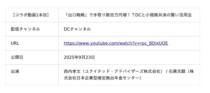 本動画のテーマである「企業型DCの賢い活用法」について、「やりすぎ税理士の資産革命チャンネル」でも、コラボ動画が公開されています。 より深い知識を身につけたい方は、こちらもご視聴ください。[表3: https://prtimes.jp/data/corp/55757/table/9_3_8349b712d9fae766fa9551537e431812.jpg?v=202510240717 ]