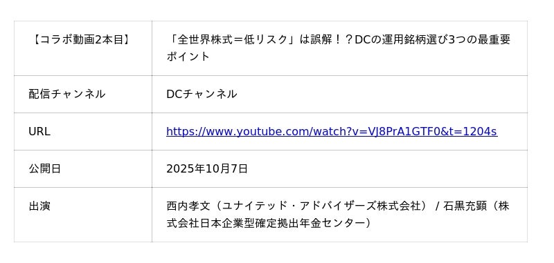 公開日:2025年9月23日 出演:西内孝文(ユナイテッド・アドバイザーズ株式会社) / 石黒充顕(株式会社日本企業型確定拠出年金センター)