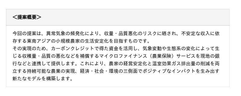 事業内容  :カーボンクレジット創出販売事業、農業関連事業、環境関連事業、その他、関連する事業及びESGコンサルティング事業