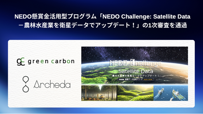 自然由来のカーボンプロジェクトのためのdMRVソリューションを開発する株式会社Archeda(本社:東京都千代田区、代表取締役:津村 洸匡、以下、Archeda(読み:アルケダ))は、カーボンクレジットの創出・登録・販売までを一気通貫してサポートする事業を展開するGreen Carbon株式会社(代表取締役:大北 潤、以下Green Carbon(読み:グリーンカーボン))と、NEDO(国立研究開発法人新エネルギー・産業技術総合開発機構)主催の「NEDO Challenge: Satellite Data-農林水産業を衛星データでアップデート!」に共同で応募し、1次審査を通過したことをお知らせします。