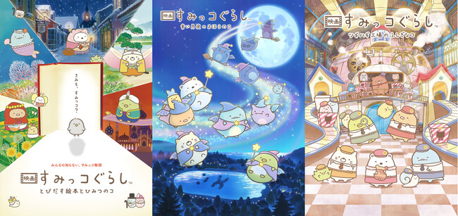 (左から)『映画 すみっコぐらし とびだす絵本とひみつのコ』(C)2019日本すみっコぐらし協会映画部 / 『映画 すみっコぐらし 青い月夜のまほうのコ』(C)2021 日本すみっコぐらし協会映画部 / 『映画 すみっコぐらし ツギハギ工場のふしぎなコ』(C)2023 日本すみっコぐらし協会映画部
