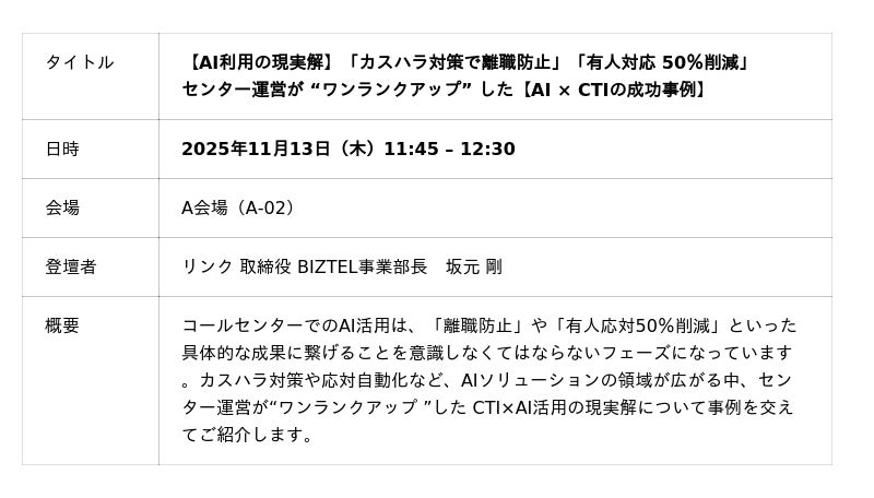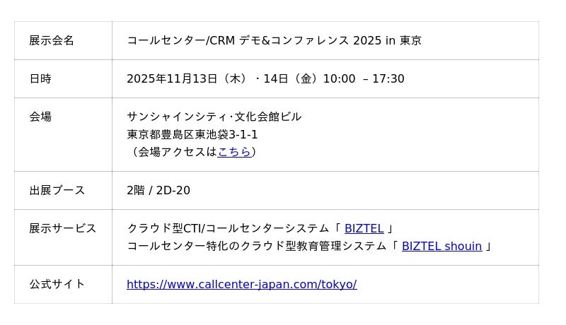 8年連続 国内シェア第1位(※1)のクラウド型 CTI /コールセンターシステム「 BIZTEL(ビズテル) 」を展開する株式会社リンク(本社:東京都港区、代表取締役社長:岡田 元治、以下 リンク)は、2025年11月13日(木)・14日(金)に開催される、コールセンター/CS業界向けの日本最大級のイベント「コールセンター/CRM デモ&コンファレンス 2025 in 東京」に出展します。