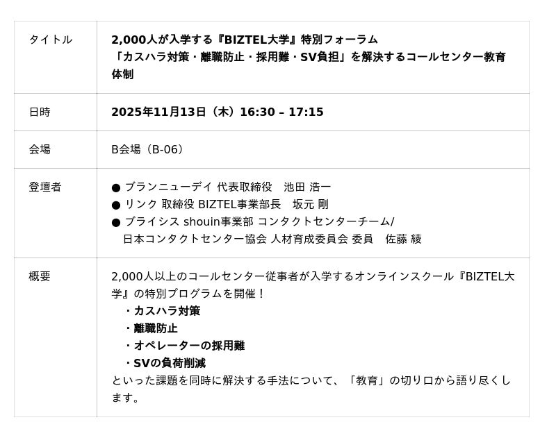 BIZTEL shouinの展示では、昨今社会問題にもなっている“カスタマーハラスメント対応”をする際の心構えやタイプ別の具体的な対処法、ストレス耐性を向上させるセルフケアなどが学べる最新のプリセット研修動画をはじめ、応対品質の評価・フィードバックが効率化する「音声レビュー機能」など、教育・研修課題を解決する多彩な機能を展示します。