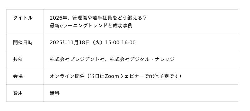 特別開催!株式会社プレジデント社×株式会社デジタル・ナレッジ 共催セミナー「2026年、管理職や若手社員をどう鍛える? 最新eラーニングトレンドと成功事例」