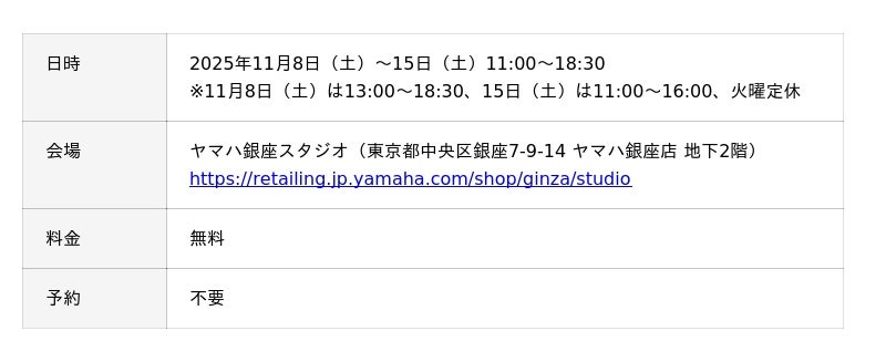 期間:2025年11月8日(土)~15日(土)、会場:ヤマハ銀座スタジオ(ヤマハ銀座店 地下2階)
