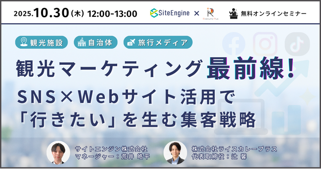 ニッチトップ戦略に基づくブランドプロデュース事業を展開する株式会社MUSCAT GROUP(本社:東京都渋谷区、代表取締役:大久保 遼、証券コード:195A)の連結子会社である株式会社ライスカレープラス(本社:東京都渋谷区、代表取締役:辻 馨)は、2025年10月30日(木)にサイトエンジン株式会社と共同で、観光施設・自治体・旅行メディア向け無料オンラインセミナー「観光マーケティング最前線!SNS×Webサイト活用で『行きたい』を生む集客戦略」を開催いたします。