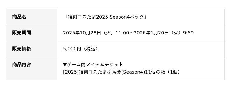 [画像3: https://prcdn.freetls.fastly.net/release_image/25063/2011/25063-2011-cb4078c7f38181dbf95a838494d451ee-780x420.png?width=536&quality=85%2C75&format=jpeg&auto=webp&fit=bounds&bg-color=fff ]「復刻コスたま2025 Season4パック」販売開始!