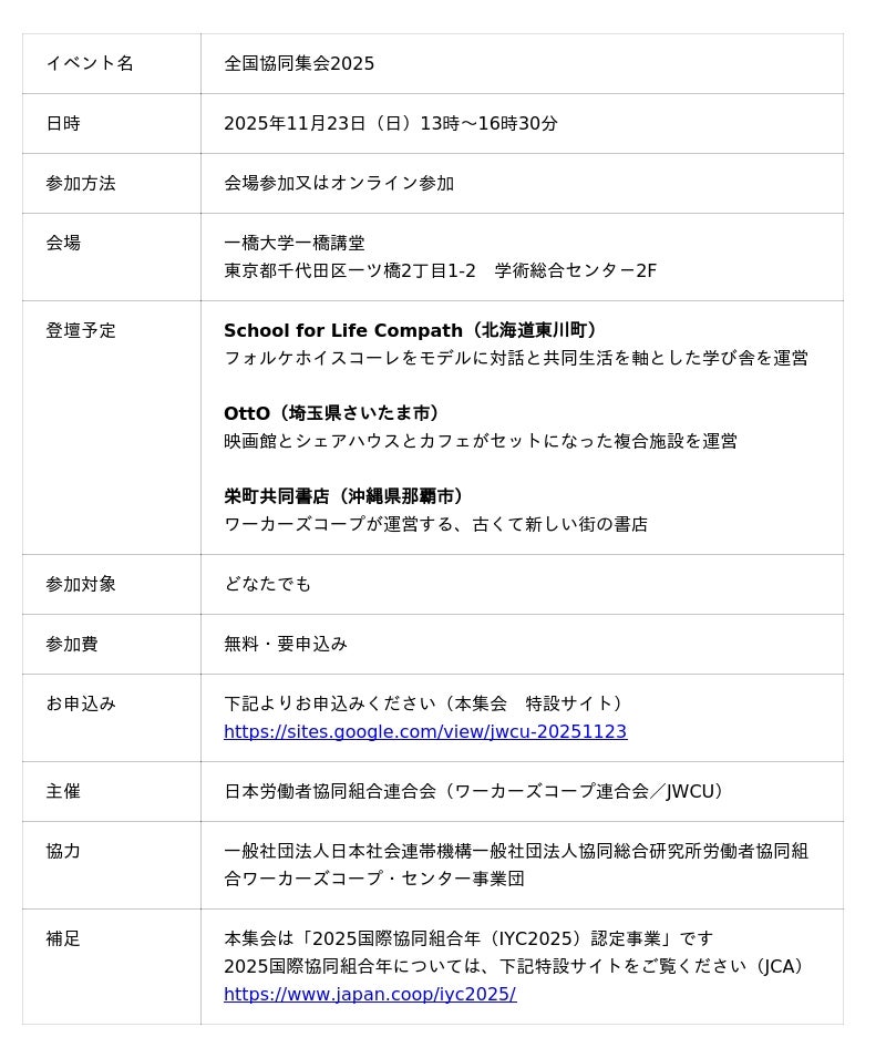 「全国協同集会2025」事務局団体ワーカーズコープ連合会