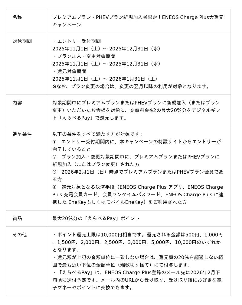 ENEOS株式会社(以下、「ENEOS」)は、2025年11月1日(土)から2026年1月31日(土)までの間、ENEOSが提供するEV充電サービス「ENEOS Charge Plus」において、プレミアムプラン・PHEVプラン※1新規加入者限定!「ENEOS Charge Plus大還元キャンペーン」(以下、「本キャンペーン」)を実施しますので、お知らせいたします。