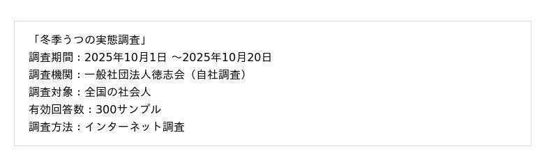 一般社団法人徳志会(所在地:東京都品川区、代表理事:河口雅弘)は、心療内科・精神科クリニックである新宿心療内科よりそいメタルクリニック(新宿駅東口徒歩3分)横浜心療内科よりそいメタルクリニック(横浜駅西口徒歩2分)柏心療内科よりそいメンタルクリニック(柏駅徒歩0分、2025年10月オープン)を運営し皆様のメンタルヘルスをサポートしております。今回は冬季うつに関する調査を実施したので、その結果を紹介します。